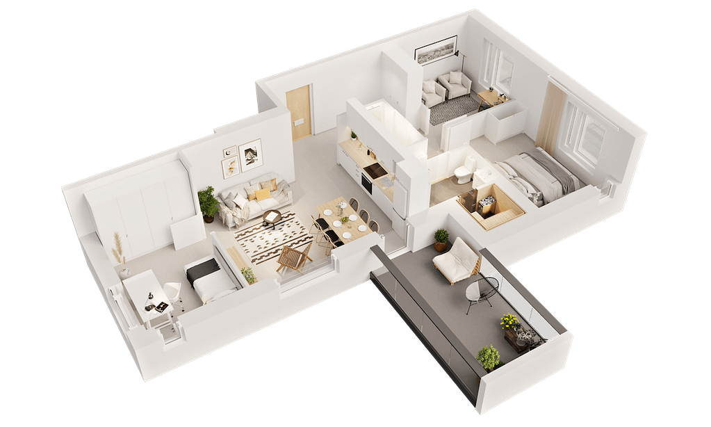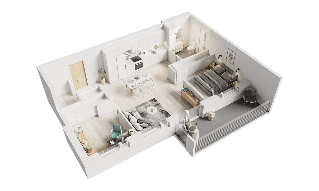 Ett 3D-våningsplan möjliggör en exakt och tydlig översikt av bostadens layout från ett fågelperspektiv, vilket låter köpare föreställa sig själva i utrymmena och uppfatta dess proportioner. På Visu24 skapar vi varje 3D-våningsplan noggrant för att säkerställa att det bistår kundens rumsuppfattning och underlättar försäljningsprocessen.