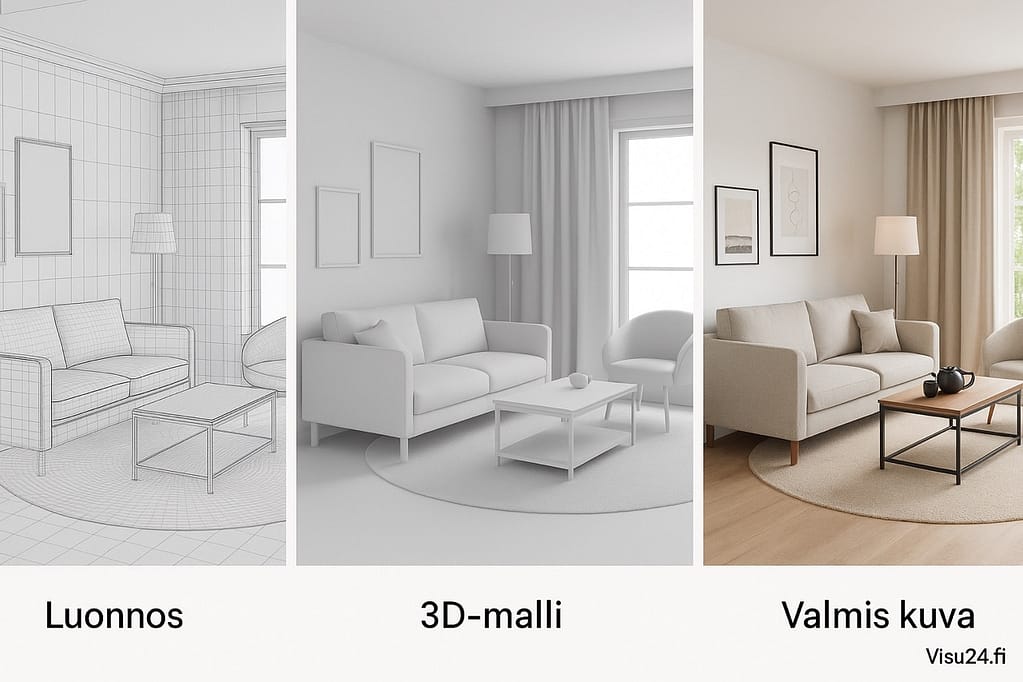 Muista, että visualisoinnin hinta koostuu useista komponenteista: lähtötietojen käsittelystä, 3D-mallinnuksesta, materiaalien määrittelystä, renderöinnistä, kommentointikierroksista, jälkikäsittelystä ja projektinhallinnasta.